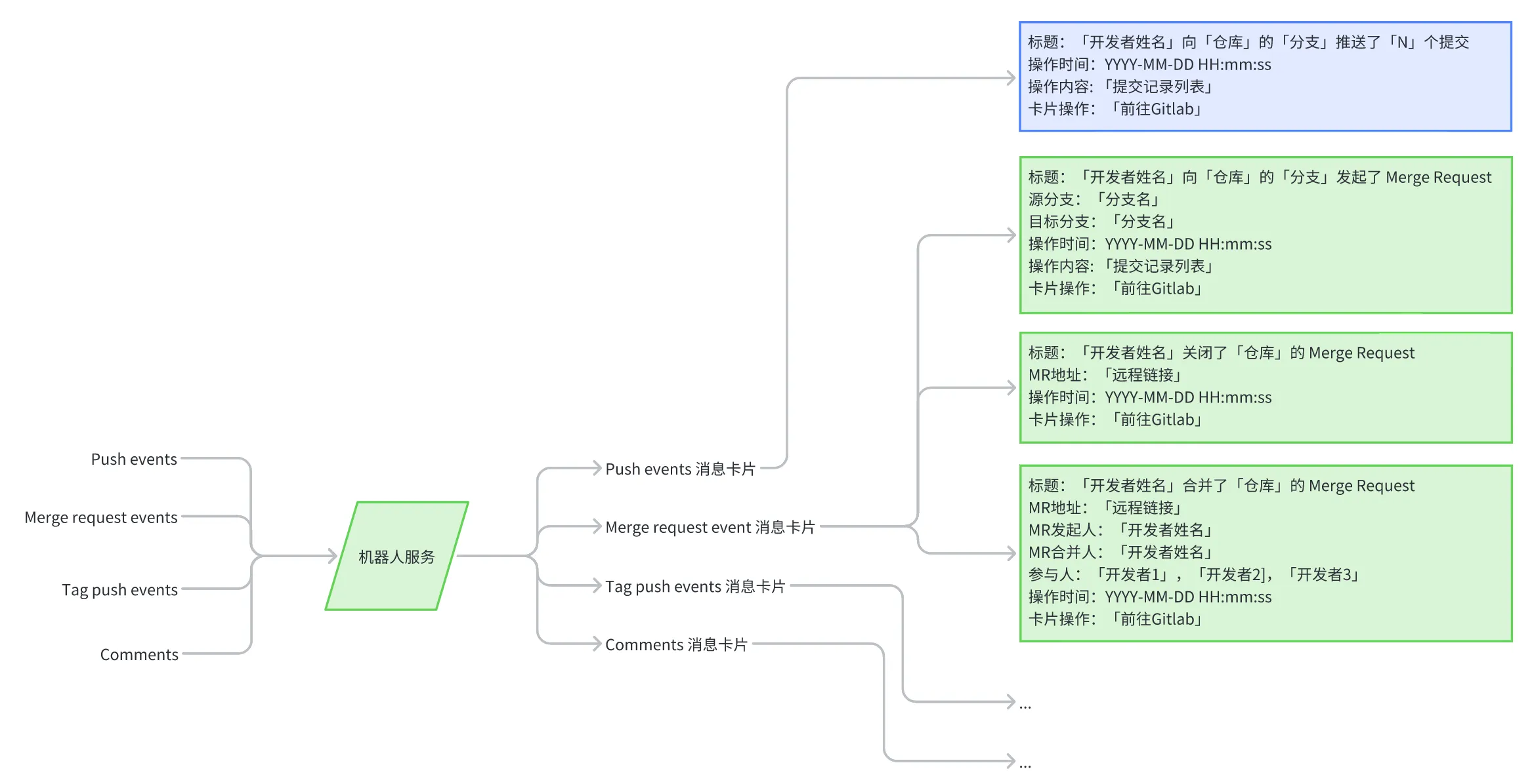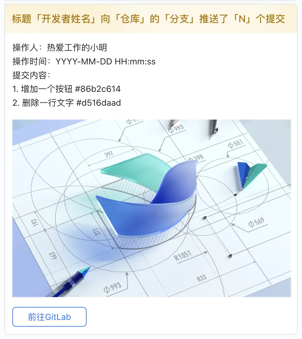 呵,代码Push到飞书通知的过程就是这么简单。接下来依葫芦画瓢,Gitlab的消息集成大致就这么些内容,图中展示了Push 和 Merge Request 的卡片内容,其他的后续再补充。