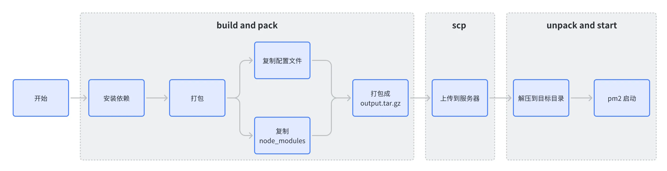 因为是Node.js项目,部署方式和普通的静态页面有些许不同。对于纯静态资源的项目而言,所有的依赖和代码都被打包在一起,将产出物上传到服务器上就行。Node.js 项目通常是不打包的,依赖都放在node_modules中,为了能在服务器上正常运行,需要将node_modules 目录等依赖一起上传到服务器。整个过程如下图所示: