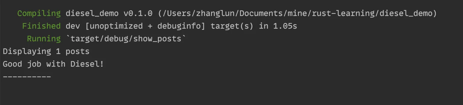 现在我们已经成功写入了一条数据,但是执行cargo run --bin show_posts