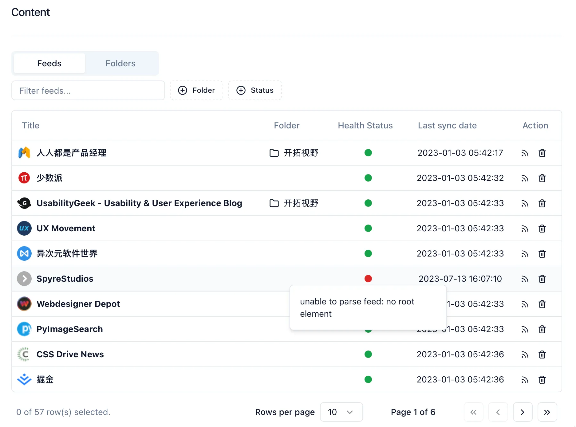 在Lettura的设置模板中,提供了简单的查看和删除的能力。为了让用户能够更加高效的管理订阅,我决定给每一个RSS源标增加一个健康标记,health_status。每次更新时,如果不能正确获取到源提供的内容,就将其健康标记设置为不健康bad,同时将原因保存在failure_reason中。