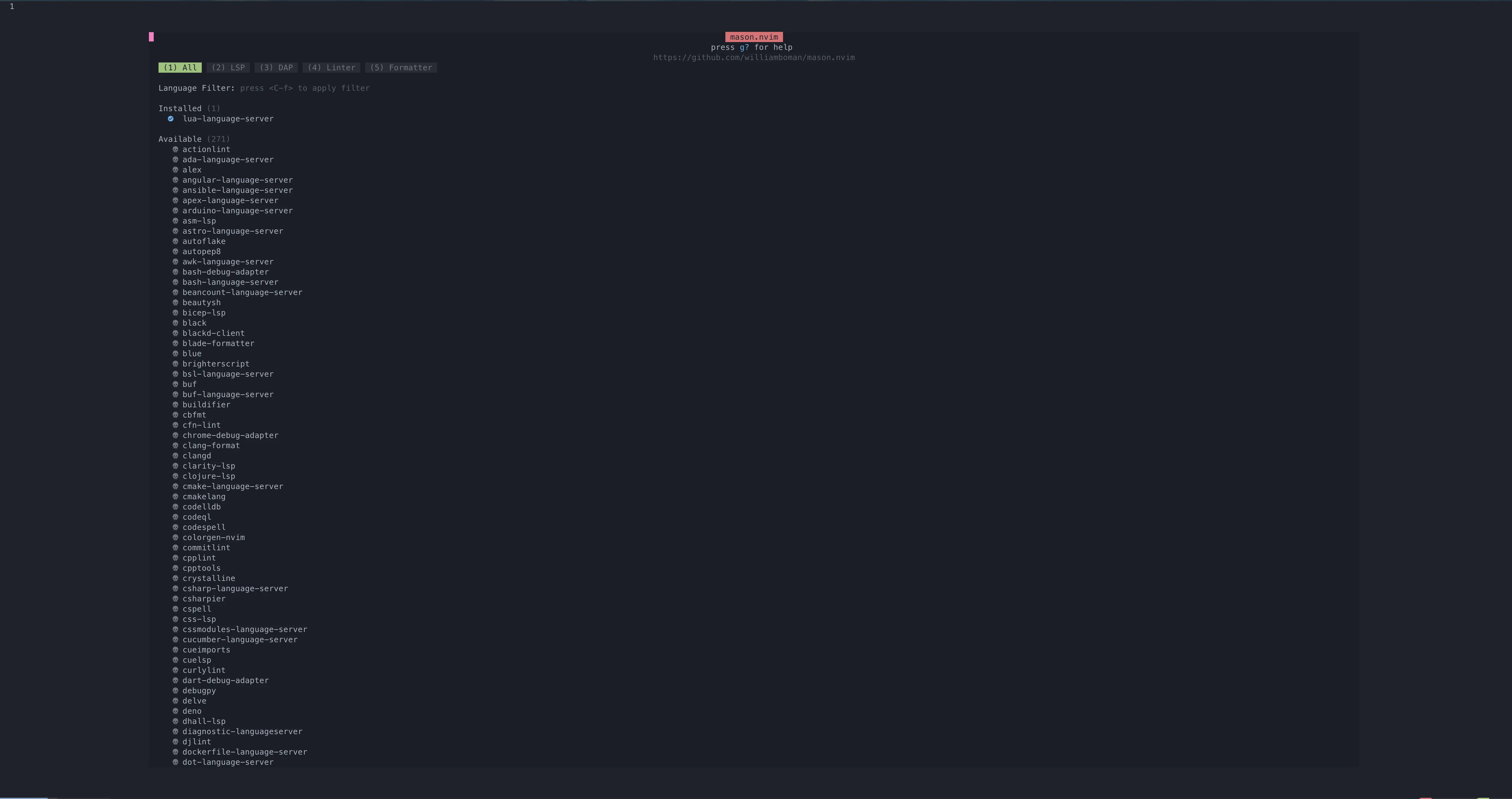 可以看到 NcChad 使用了 mason.nvim 来管理外部插件,比如 LSP server、DAP server、linter和formatter等。在我的一通操作安装好了常用的一些插件。接下来在日常工作中多用用,慢慢完善属于自己的定制配置。