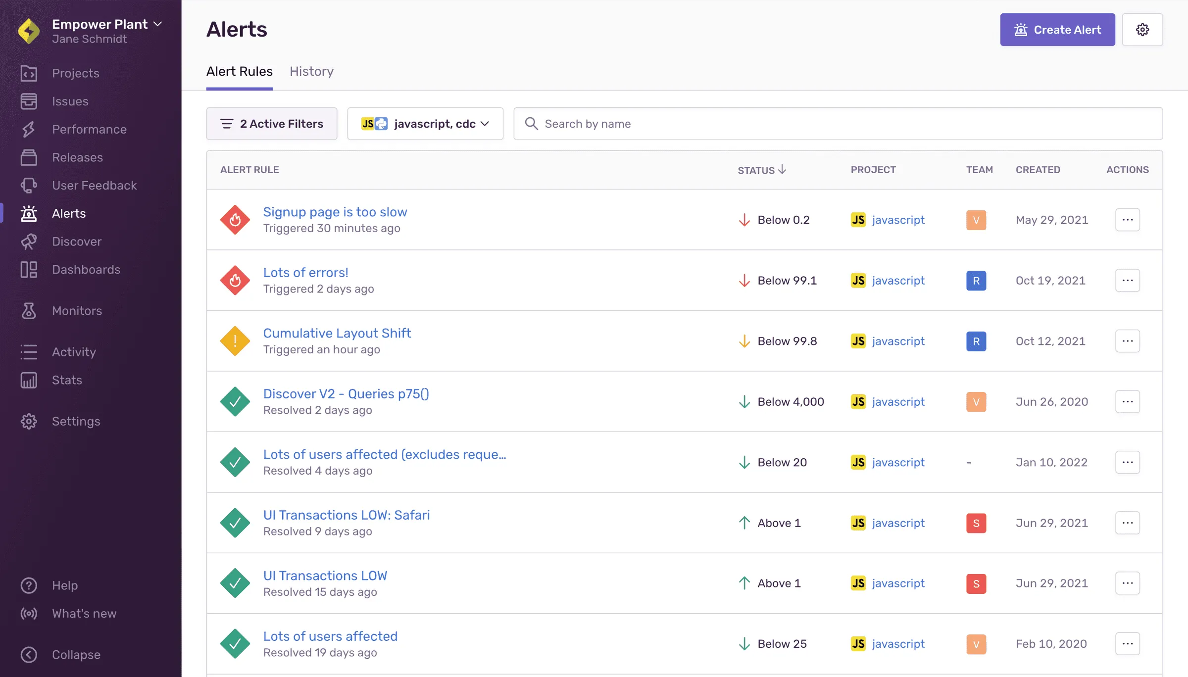 在Sentry的Alert页面中可以创建新的警报规则并管理现有警报规则。“警报规则”选项卡显示现有警报规则及其当前状态、项目、团队和创建日期。