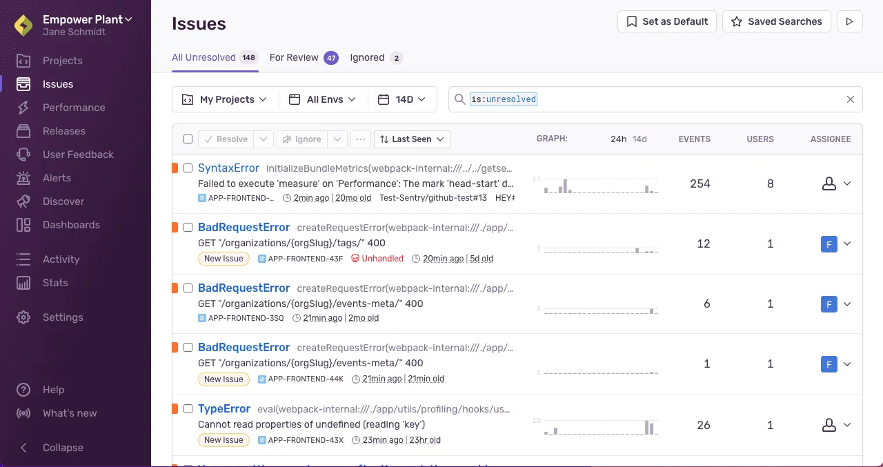 错误 Issue 是 Sentry 最常见的 Issue 类型,它表示应用程序或服务中发生的错误或异常。当 Sentry 捕获到一个错误或异常时,它会创建一个错误 Issue,并记录错误的详细信息,如错误类型、堆栈跟踪、请求信息等。
