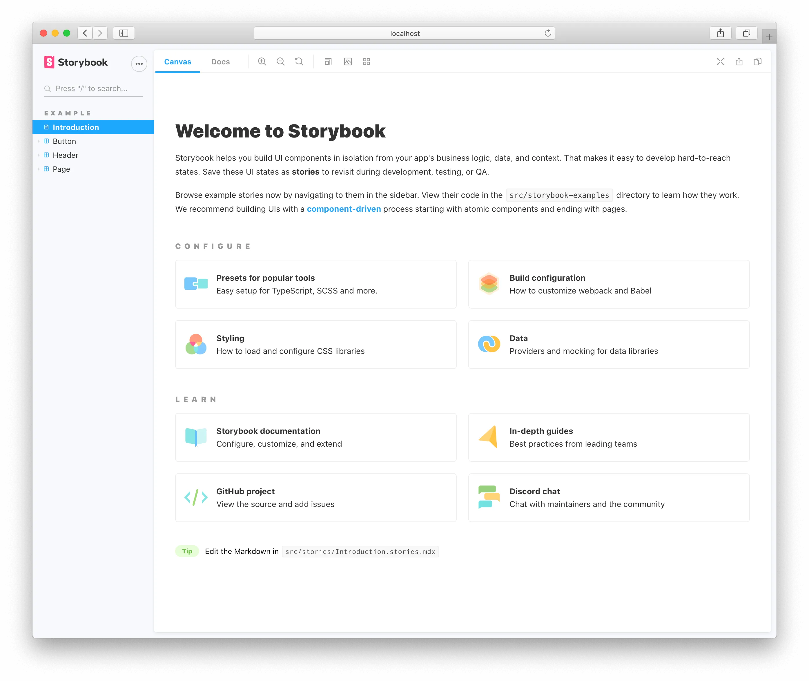 当你启动执行 yarn storybook 时,会启动一个dev server,并自动在浏览器中打开一个页面,显示欢迎界面。
