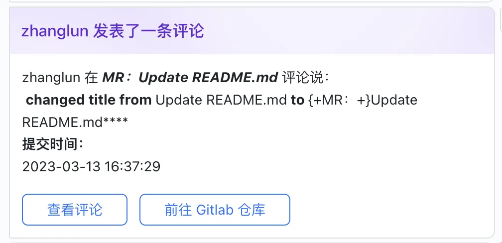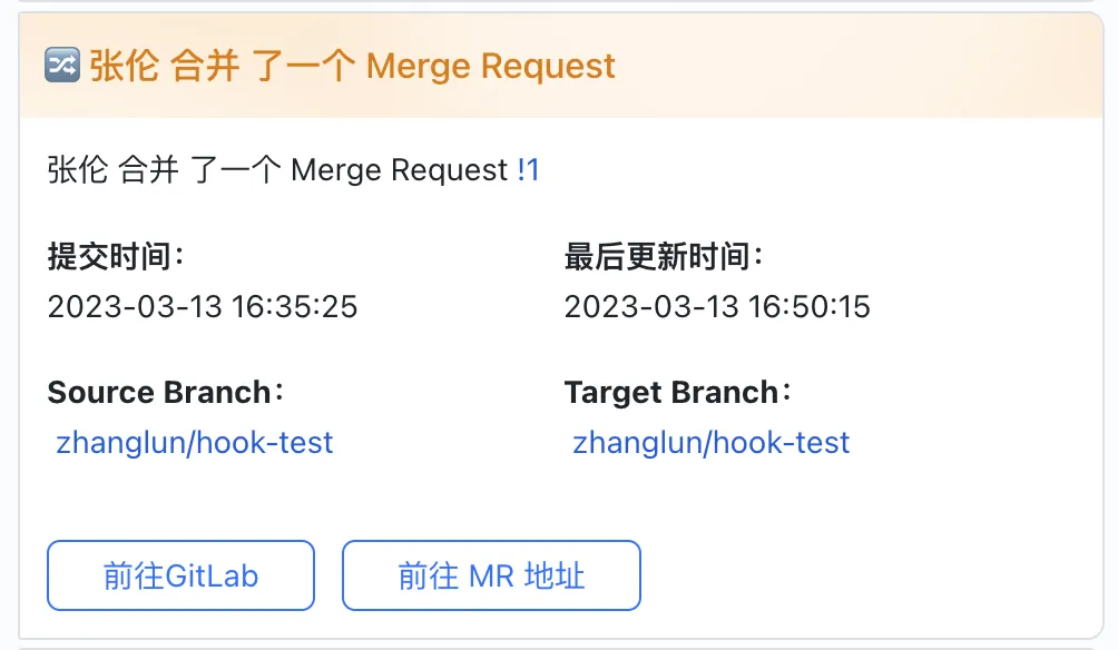 呵,代码Push到飞书通知的过程就是这么简单。接下来依葫芦画瓢,Gitlab的消息集成大致就这么些内容,图中展示了Push 和 Merge Request 的卡片内容,其他的后续再补充。