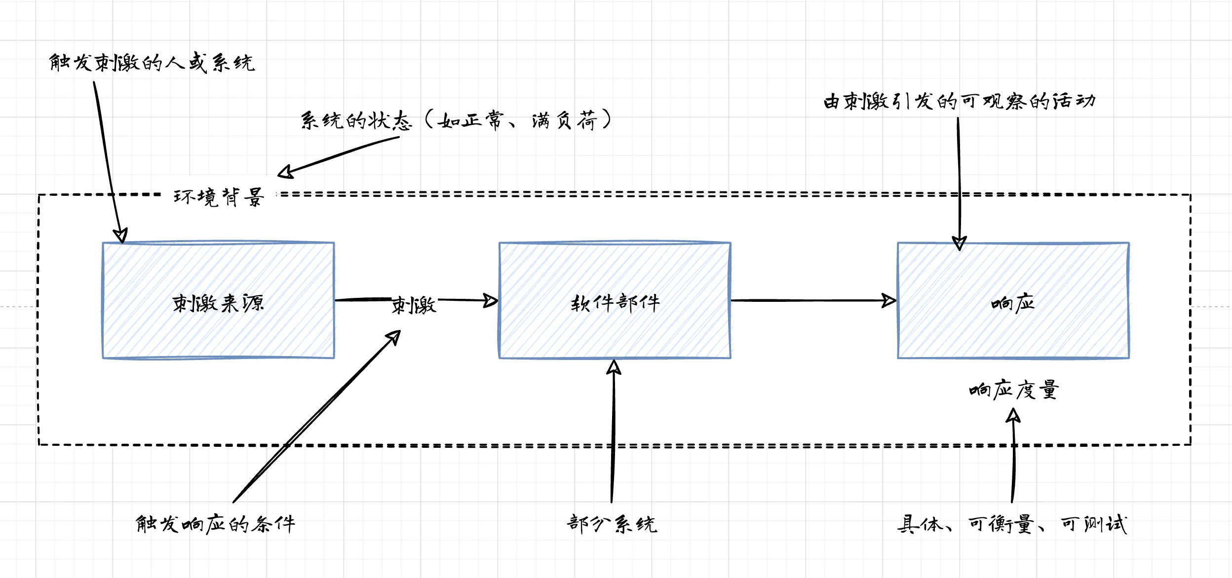 刺激 刺激是一个需要系统以某种方式做出响应的事件。刺激启动了一个场景,其类型由质量属性的类型决定。例如,可用性场景的刺激可能是节点变得不可用了,而可修改性场景的刺激可能是一个变更请求。