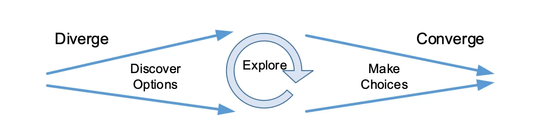 设计探索时反复地发散和聚合的过程。确定问题后,就需要发散思维,探索解决问题的各种方案。找到备选方案后,又需要聚合思维,取得共识,排除不合适的方案。