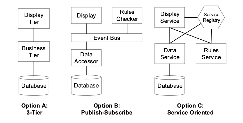 假设我们要构建一个数据驱动的Web应用。你会选择哪种架构模式?下图展示了三种模式:三层模式、发布-订阅模式、面向服务架构模式。