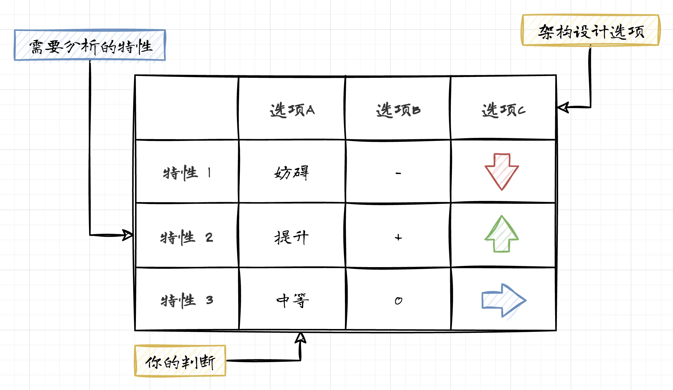 决策矩阵是一个简单的表格,用于总结分析多个架构设计方案的利弊。它适合用来选择选择与架构相关的各种设计选项,包括架构模式、功能分配、技术方案等。