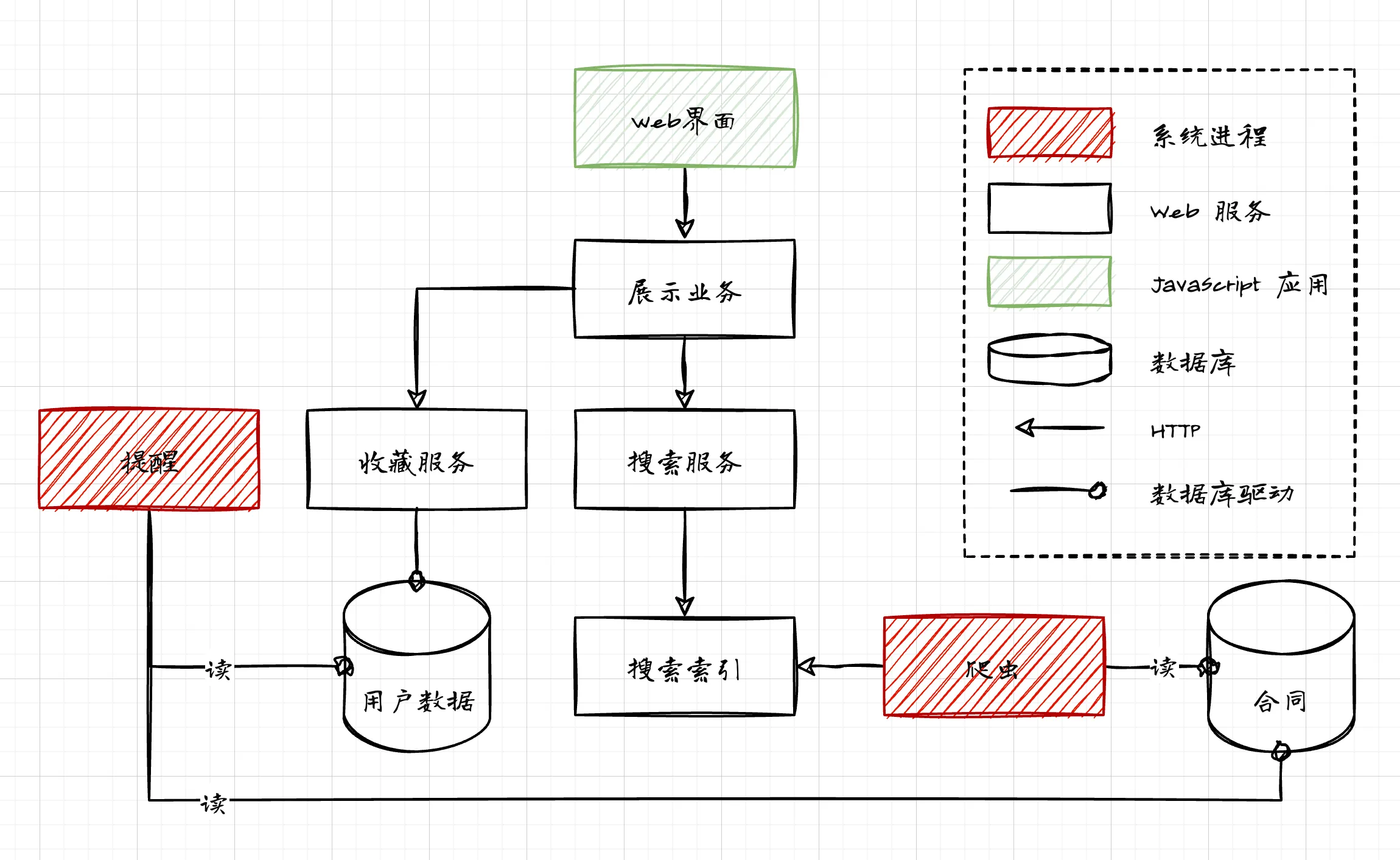 这些功能需求还隐含了几项功能:用户可以搜素,意味着必须建立索引:要显示合同和公司信息,就必须存储它们:能够订阅,就要求系统存储电子邮件地址;更新时要提醒用户,就要做到可以识别更新。下图展示了用于实现这些功能需求的元素
