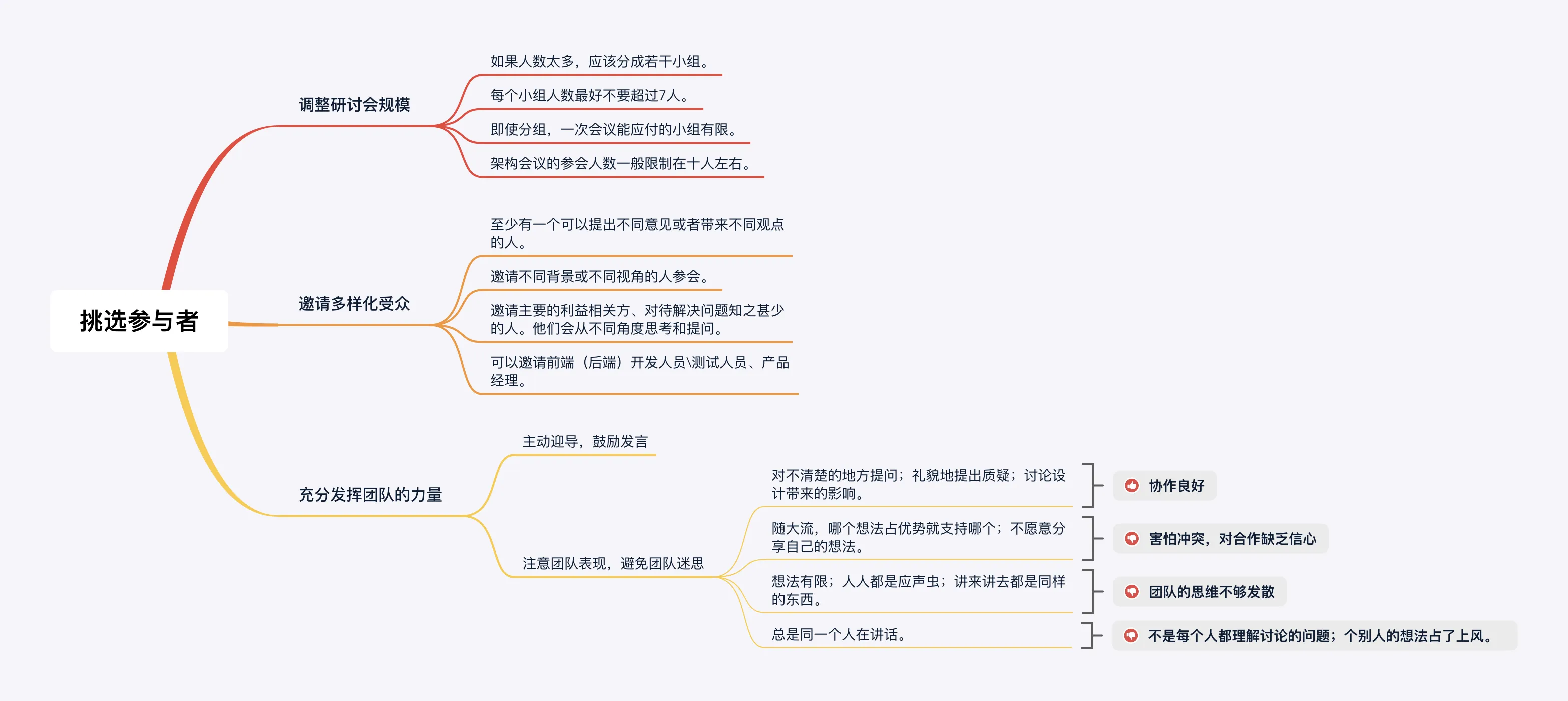 参与者决定了研讨会的质量。与会者太多会增加会议成本:不合适的参与者会妨碍建设性的讨论,影响研讨的深度和质量。主持人需要在会议规模和人员多样性之间做出取舍。