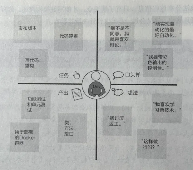 从这张移情图中不难看出,这位开发人员需要一份清晰的、有逻辑依据的文档,因为他喜欢就每个决策展开辩论。他对部署感兴趣,并且关注技术细节。